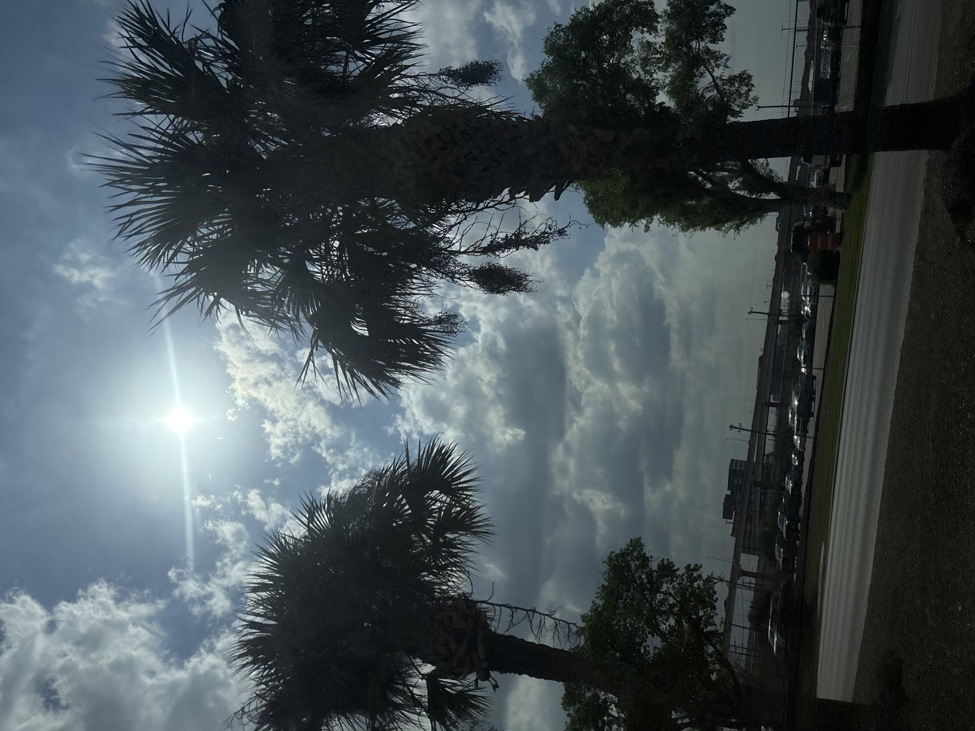 This image captures an outdoor, urban scene in San Antonio, Texas, United States of America, under a partly cloudy sky with direct sun exposure. The sun, positioned in the upper-right quadrant, exhibits significant lens flare due to direct camera angle. Two large palm trees are prominently silhouetted against the bright sky; one on the left and a larger one on the right, which displays multiple dark, dried fruit clusters or remnants hanging from its fronds. Additional smaller deciduous trees are visible in silhouette beneath the palm trees. In the lower mid-ground, a dark, paved surface, consistent with a road or parking area, runs horizontally across the frame. To the right of this surface, a strip of mown grass is present. Beyond the paved area, a chain-link fence encloses a lot containing multiple parked vehicles, predominantly dark-colored. An orange construction barrel is visible within this area on the right side. In the background, an elevated concrete highway structure extends horizontally. Beneath and beyond this structure, several dark, multi-story urban buildings are faintly discernible. No people, specific actions, or interactions are visible. The scene is heavily backlit, resulting in most foreground and mid-ground elements appearing as dark silhouettes against the bright, cloud-dotted sky.