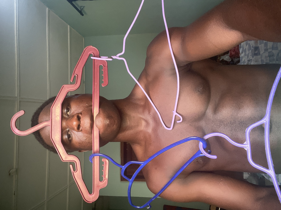 A dark-skinned male individual, shirtless, faces the camera in a close-up indoor shot. He holds a red-pink plastic clothes hanger horizontally between his lips. Attached to this hanger are a blue plastic hanger on the left side and a light purple plastic hanger on the right, both extending downwards over his muscular chest. A fourth light purple plastic hanger is partially visible at the bottom center. The background features a light green wall on the right, a lighter colored wall with a partial wooden door frame on the left, and a white paneled ceiling. Blurry patterned fabric, consistent with bedding, is visible on the far right. The scene is illuminated by ambient light. The specific location within Ado, Nigeria, is not discernible from the visual information provided.