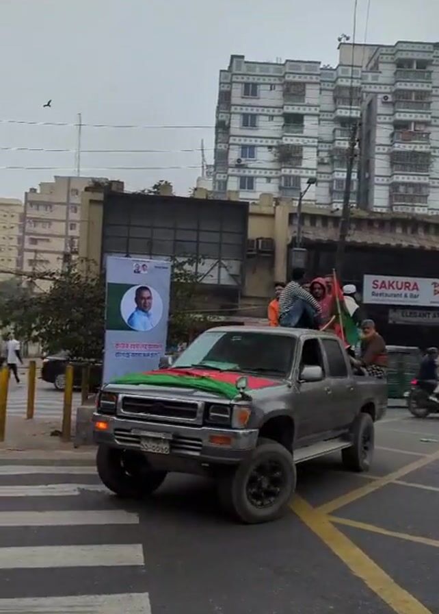 A silver Toyota pickup truck, adorned with green and red decorations that resemble the flag of Bangladesh, is driving through a city intersection. The truck bed is crowded with about 8-10 people. Some are holding the flag of Bangladesh. The truck's license plate appears to read "DD-0036". In the background, there are several tall buildings and signs including one for "Sakura Restaurant & Bar". A pedestrian crossing is visible in the foreground. The sky is overcast. The video follows the truck as it crosses the intersection.