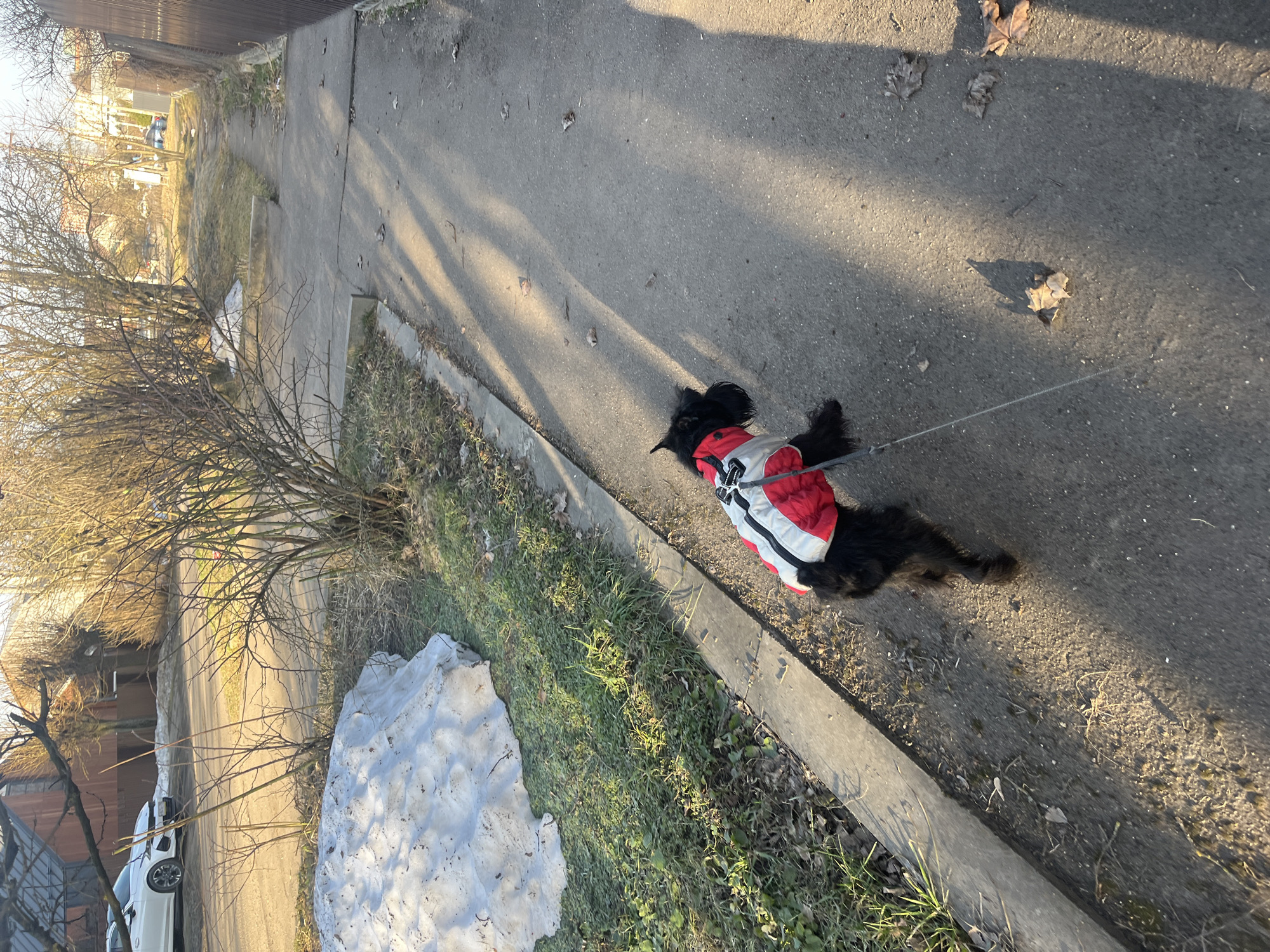 A small black dog wearing a red and white harness lies on a gray concrete sidewalk in what appears to be a residential area. The leash extends toward the top right of the frame. To the left of the sidewalk is a patch of grass, a bush with bare branches, and a melting pile of snow. The location is Podolsk, Russia. The scene is illuminated by sunlight.