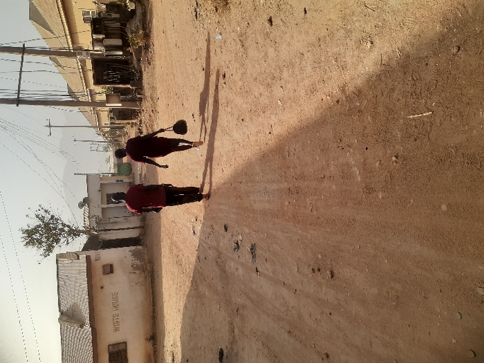 An overhead-angle image depicts an unpaved, reddish-brown dirt road in a residential area of Bauchi, Nigeria, under bright daylight conditions with a low sun angle casting long shadows forward