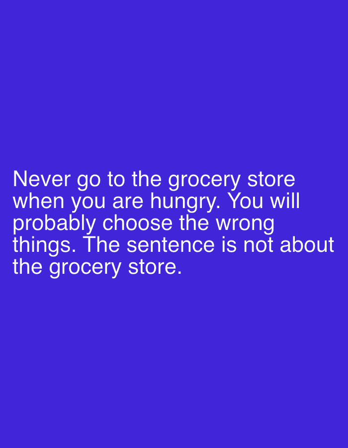 The image is a solid blue background with white text. The text reads, "Never go to the grocery store when you are hungry. You will probably choose the wrong things. The sentence is not about the grocery store." The message is a piece of advice, suggesting that hunger can lead to poor decision-making. The last sentence implies the analogy extends beyond grocery shopping.