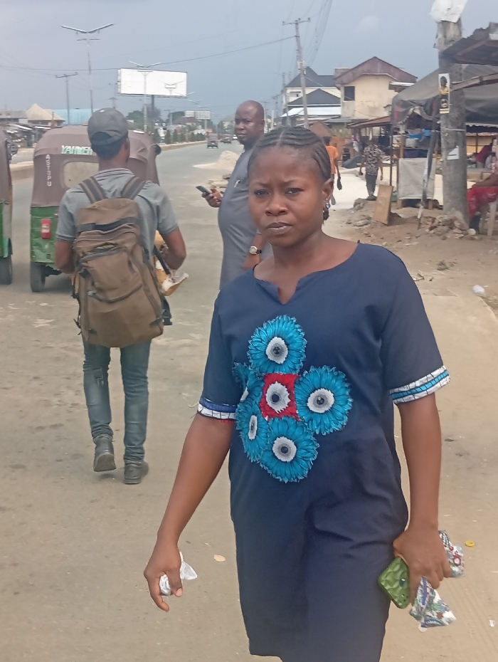 A woman in a dark blue dress with a floral pattern stands on a street. She holds a phone and tissue in her hands. In the background, a man in a gray suit holds a phone near his ear. Further back, a man with a backpack walks away from the camera, passing a green vehicle. There are buildings and an overcast sky in the distance.