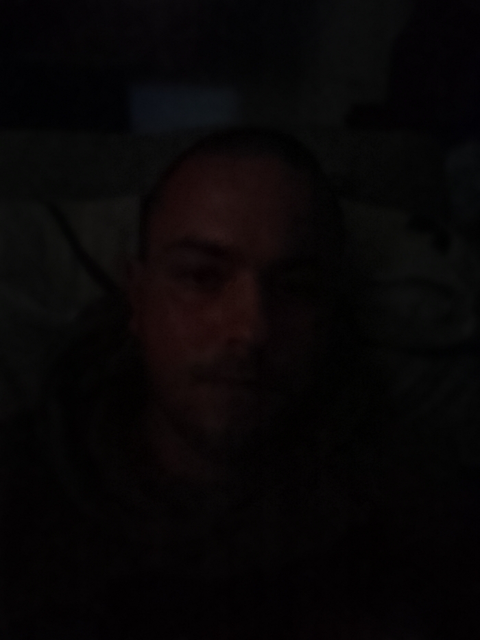 The image is a dark close-up of a man's face. The image is blurry and it is difficult to make out any details. The coordinates provided (latitude: 51.509, longitude: 7.383) correspond to a location in Dortmund, Germany. The man is likely in a residential area, possibly a bedroom, as the image shows a pillow in the background. The image is taken from a low angle, likely from the man's own perspective. He appears to be in the process of taking a selfie. The room is poorly lit.