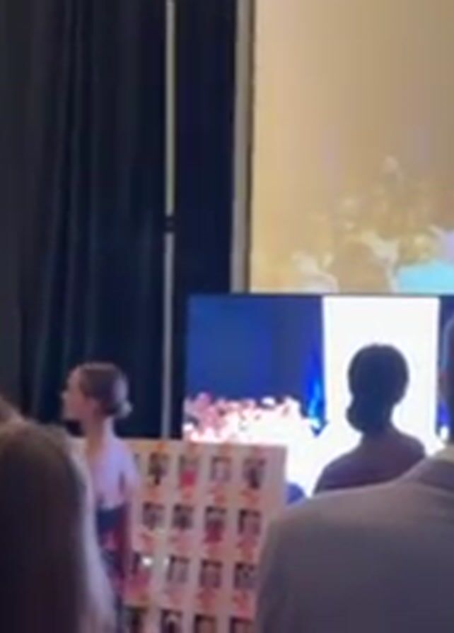 group of people, mostly young women, standing in what appears to be a backstage area of a fashion show. Some of the women are dressed in formal wear, possibly as models. A man in a dark jacket is adjusting the dress of one of the models. Behind them, there are black curtains and some equipment like light stands. In the background, there is a large screen displaying a live feed of the fashion show, showing a model walking the runway. A smaller monitor also displays the show. The people in the video are watching the screen and seem to be either preparing for their turn or observing the ongoing show. There is also a board with images on it, likely related to the show's design or models. The room seems well-lit and professionally set up, suggesting a coordinated event.