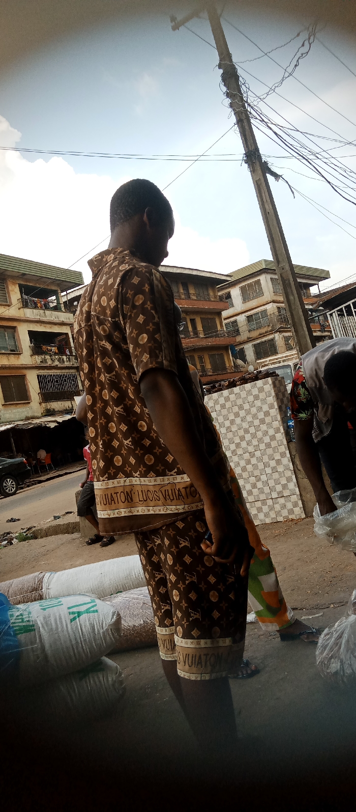 The image presents an outdoor street scene in Fegge, Nigeria, observed from a low angle under a bright, partly cloudy sky. The primary subject is a male individual, viewed from the back and slightly right of center, wearing a matching short-sleeved shirt and shorts set. The brown fabric is patterned with repeating stylized "LV" logos and a horizontal band near the garment's bottom edges displaying the text "LUOIS VUIATON". His right hand appears to hold a folded piece of multi-colored fabric (green, white, orange). To the right, another person is bent over, partially obscured, wearing a grey top and patterned bottoms, seemingly interacting with items contained in clear plastic bags on the ground. In the immediate foreground, several large white woven sacks are stacked horizontally, some displaying green text, including what appears to be "10KG". The ground is a mix of dirt and concrete. A low wall or barrier featuring a checkerboard pattern of light brown and white tiles is visible in the middle ground. In the background, a street with a black sedan partially visible leads to multiple multi-story buildings, likely residential or mixed-use, with balconies and gridded windows. One building on the left features a green roof or awning. A tall wooden utility pole, heavily adorned with numerous tangled wires, extends upwards on the right side of the frame against the light blue sky.