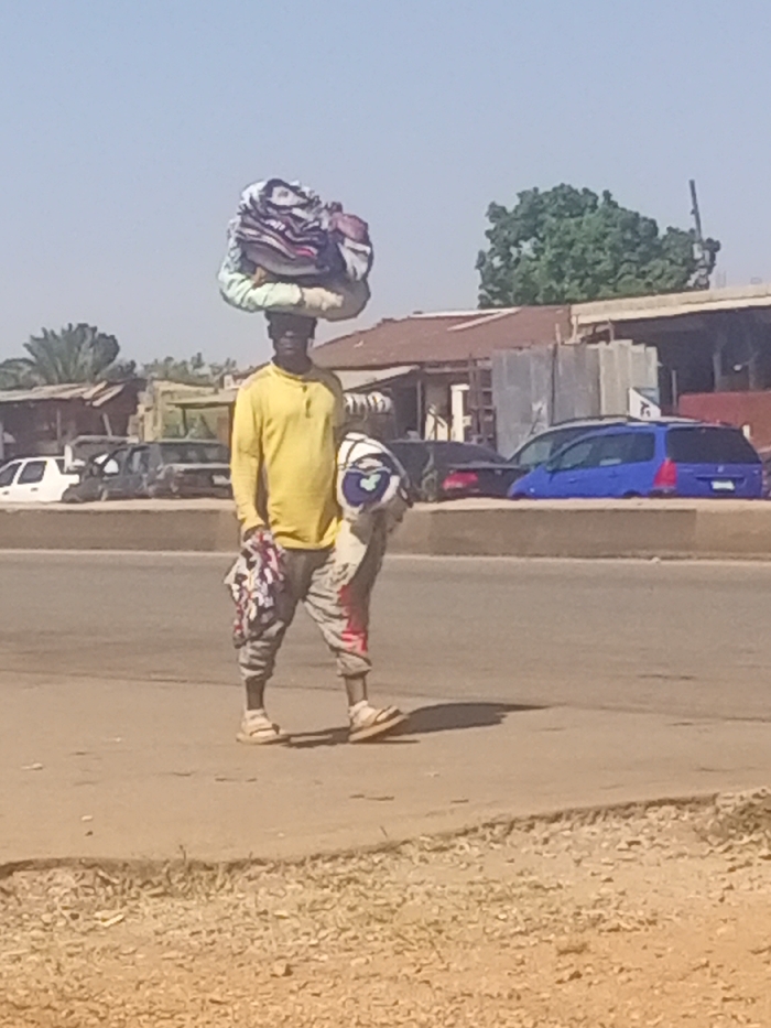 An outdoor scene in Jos, Nigeria, depicts a single male subject walking on a paved road surface under a clear, bright blue sky