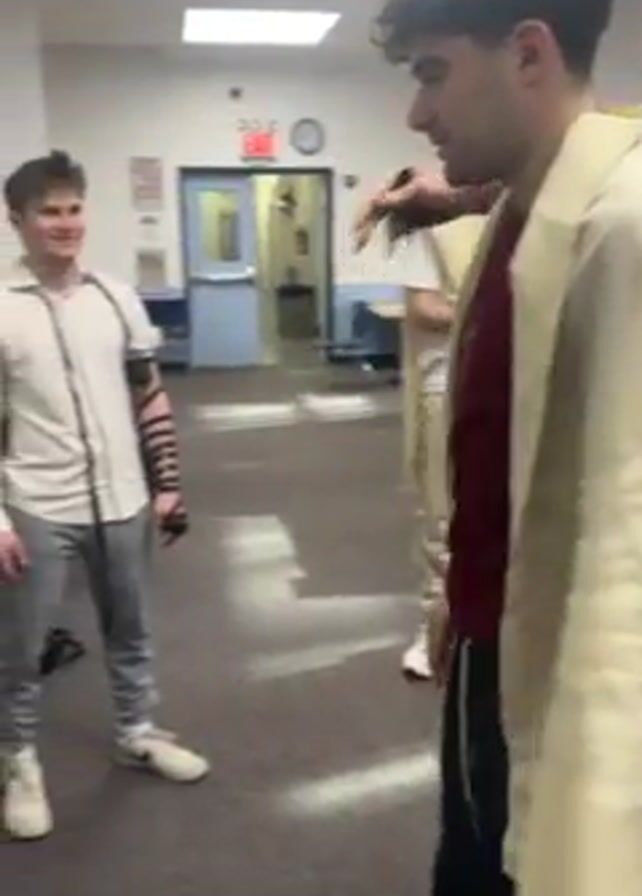 three men in a brightly lit, indoor setting, possibly a community center or synagogue. One man, wearing a kippah, is shown putting on a tallit. Another man stands nearby, smiling, wearing a light-colored shirt and gray pants. He has his hands on his hips. A third man stands in the background, also wearing light clothing. The first man has the tallit draped over his shoulders and appears to be adjusting it. To his left is a wooden table with various objects on it, including what appears to be a Torah scroll. The floor is carpeted. An exit sign is visible above a door in the background.