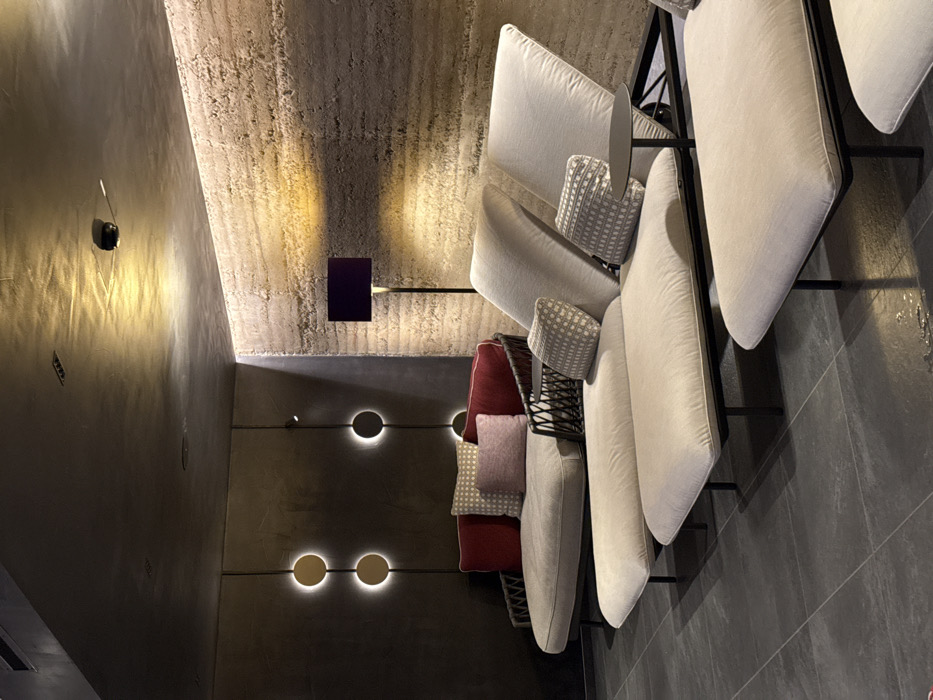 An angled overhead shot reveals a modern interior. A textured wall contrasts with a sleek, dark wall. A row of round, illuminated wall fixtures lines the dark wall. A minimalist lamp with a purple shade extends from the textured wall. Multiple light-colored chairs with geometric cushions are arranged in a row, their black frames visible against the dark floor. Additional red and patterned cushions are placed on one of the chairs.