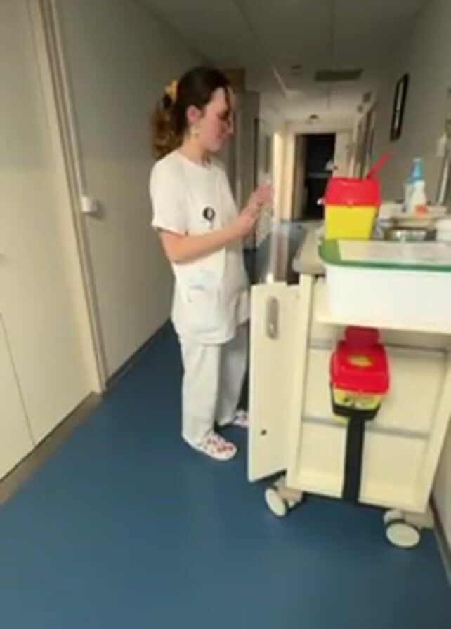 A female nurse in a white uniform and colorful shoes stands in a hospital hallway next to a locked medication cart