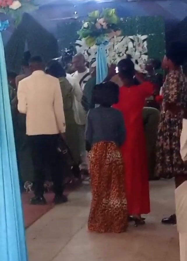 crowd of people gathered at what appears to be a wedding or a similar celebratory event, based on the decorations. There are people in various colorful outfits, including a woman in a long red dress, a child in a patterned orange skirt, and a man in a white jacket. The attendees appear to be taking pictures or watching something happening at the front of the scene. Decorations include floral arrangements, blue fabric draping, and a green leafy backdrop. The indoor lighting is bright, adding to the festive atmosphere of the gathering.