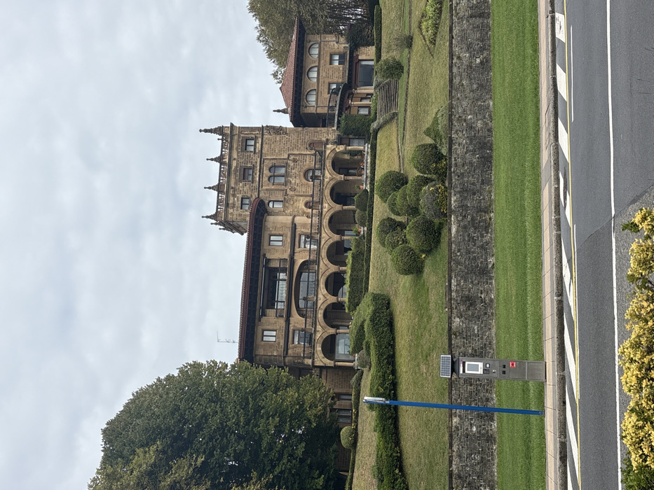 The image displays a grand, multi-story historical building situated on a landscaped hillside in Getxo, Spain, under an overcast sky. The primary structure is composed of light-colored stone masonry, featuring a prominent central tower with crenellated battlements at its apex. Multiple arched windows and rectangular window openings are visible across its facades. A large, covered veranda with several arches extends along the lower level, topped by a broad balcony with dark railings. Portions of the roof are covered with reddish-brown tiles, and a television antenna is mounted on the roof of the left wing. The building is set on a meticulously maintained, steeply sloped green lawn, which is terraced and features stone retaining walls. The landscaping includes curvilinear hedges and rows of spherical topiary bushes. Dense green trees flank the building on both sides and extend beyond its rear perimeter. In the foreground, a two-lane asphalt road with a solid white center line and a solid yellow shoulder line runs horizontally. A light-colored paved sidewalk parallels the road. On this sidewalk, a grey, upright parking payment machine with a small solar panel on its top surface is positioned next to a tall, slender blue pole. A strip of green grass and a low stone retaining wall separate the sidewalk from the private estate's landscaped grounds. No individuals are present in the scene.