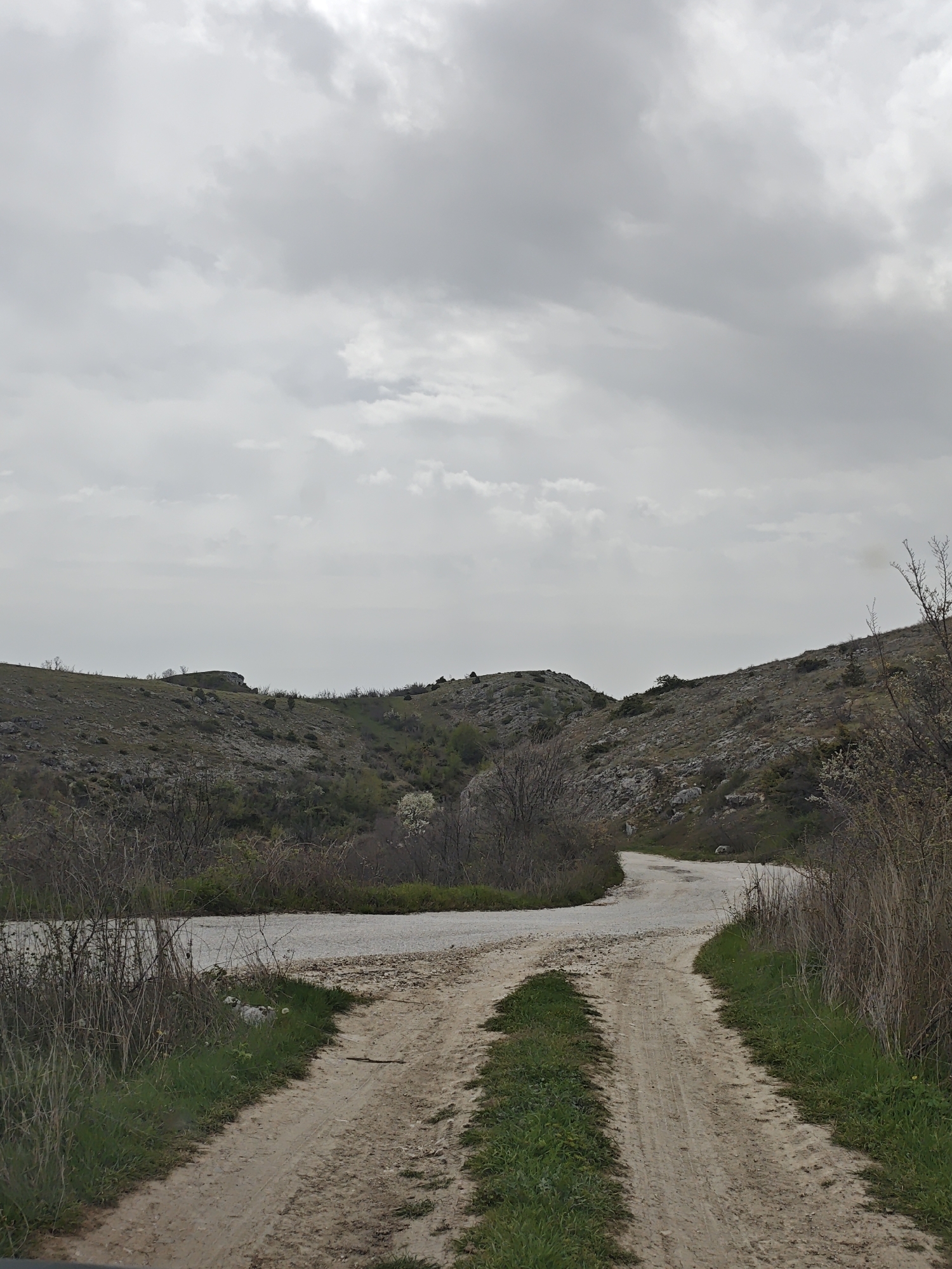 The image depicts a rural scene in Ilindentsi, Bulgaria. A dirt road with two prominent tire tracks curves through a hilly landscape. The road is bordered by sparse vegetation, including dry grasses and shrubs. The hills are rocky, with patches of green vegetation and scattered trees. The sky is overcast with gray clouds. There are no people or animals visible.