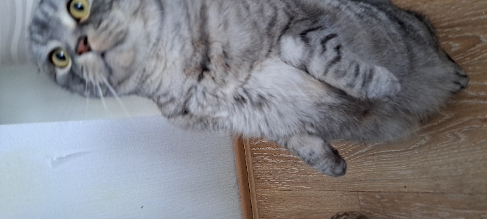 - "A grey tabby domestic cat is depicted indoors, standing upright on its hind legs with its front paws tucked against its chest" by FM-FrnGi2, licensed under CC BY 4.0