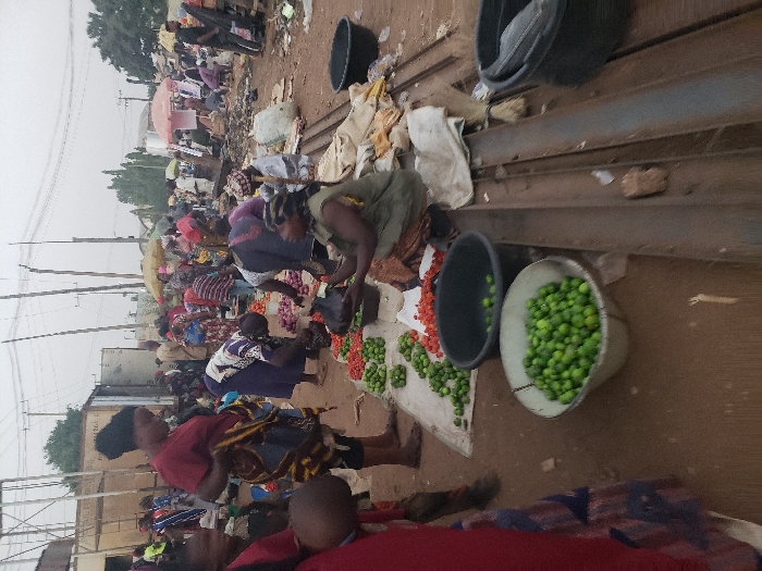 A bustling outdoor market showcases several vendors selling produce. Heaps of green limes and red tomatoes fill plastic tubs. Women are seated on the ground behind their wares. Customers mill around the stalls. The market is situated near railroad tracks. Trash and debris are scattered around the area. Overhead power lines and trees are visible in the distance.