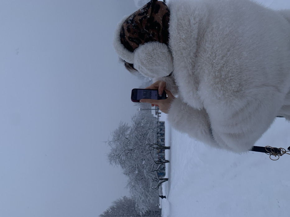 A person bundled in a white, furry coat and animal-print earmuffs stands in a snowy landscape, using a smartphone to capture a photo. The background reveals snow-covered trees and a park scene under a cloudy sky. The focus is on the person's attire and the wintry atmosphere, emphasizing the cold weather and the act of documenting the scene.