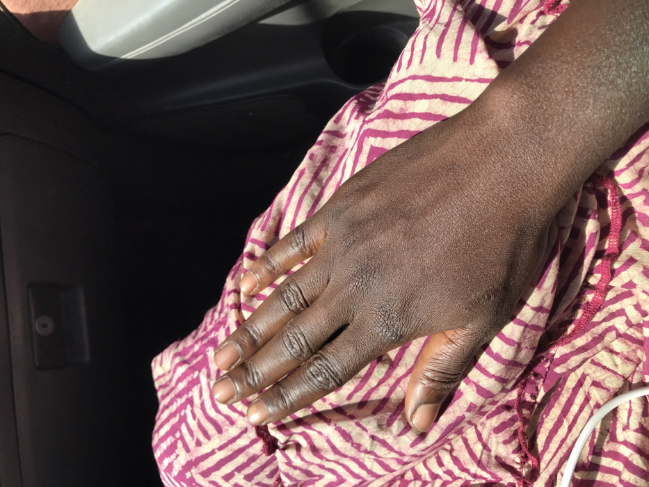 The scene is set within the interior of a vehicle in Jimeta, Nigeria. The image provides a close-up view of a right human hand and a portion of its forearm, displaying dark brown skin. The hand rests on a textile. The fingers are slightly flexed, and the fingernails are short and unadorned. The textile features a repeating pattern of magenta or deep pink irregular stripes and chevron shapes against an off-white or beige base; it exhibits minor creasing. In the upper left background, a dark vehicle interior component, likely a dashboard or glove compartment, is visible, including a dark grey latch. To the right, a lighter grey vehicle interior element, possibly a door panel or armrest, is present. Strong, direct sunlight illuminates the hand and fabric.
