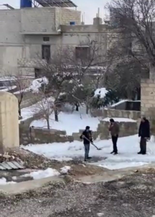 three men standing in a snow-covered courtyard with buildings in the background. One man is shoveling snow while the other two watch. The courtyard has patches of dirt and snow, and the buildings are made of gray concrete. The sky is overcast, and the bare branches of a tree are visible in the background.
