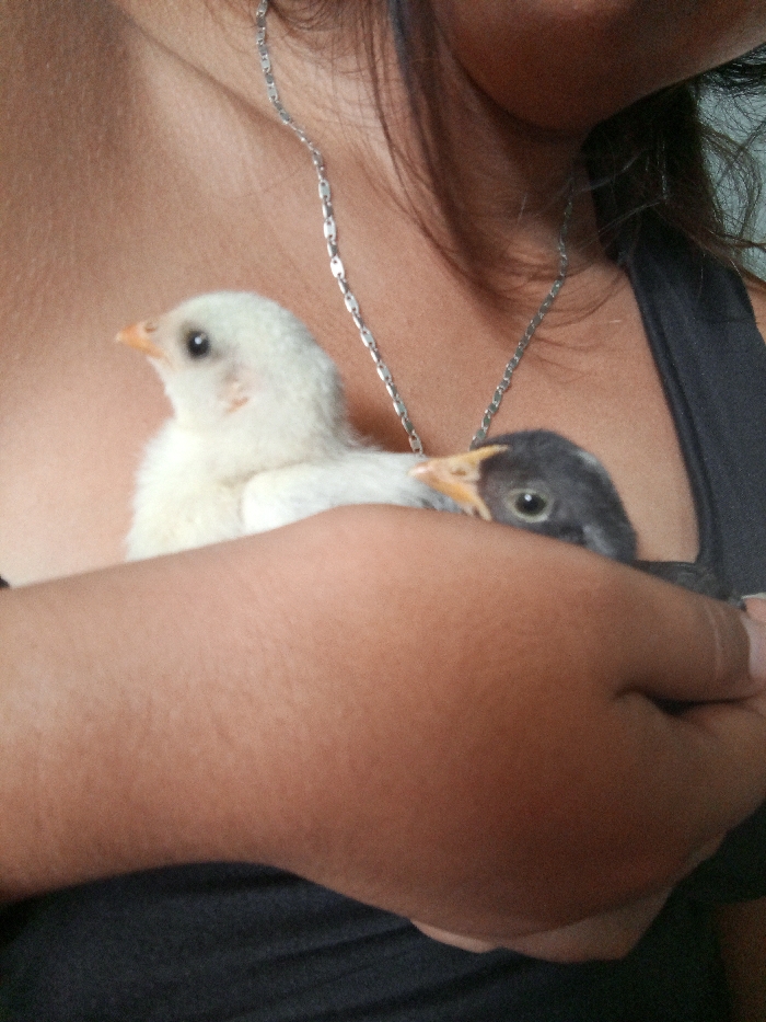 The scene depicts a partial view of a person holding two chicks