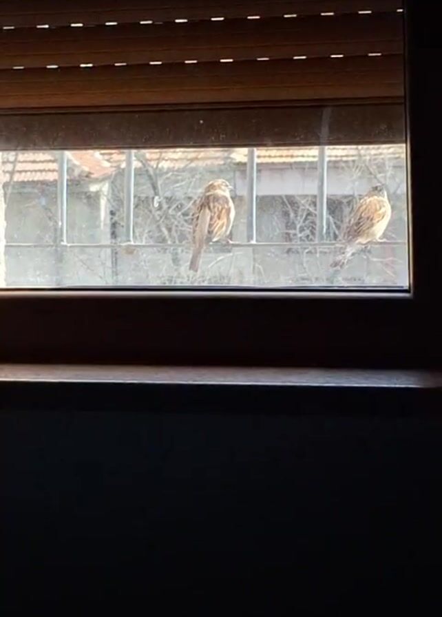 Two sparrows are perched on a metal bar outside a window. The window has partially closed blinds. Outside the window is an urban scene with bare trees and building rooftops. The windowsill is dark. A bird sound can be heard.