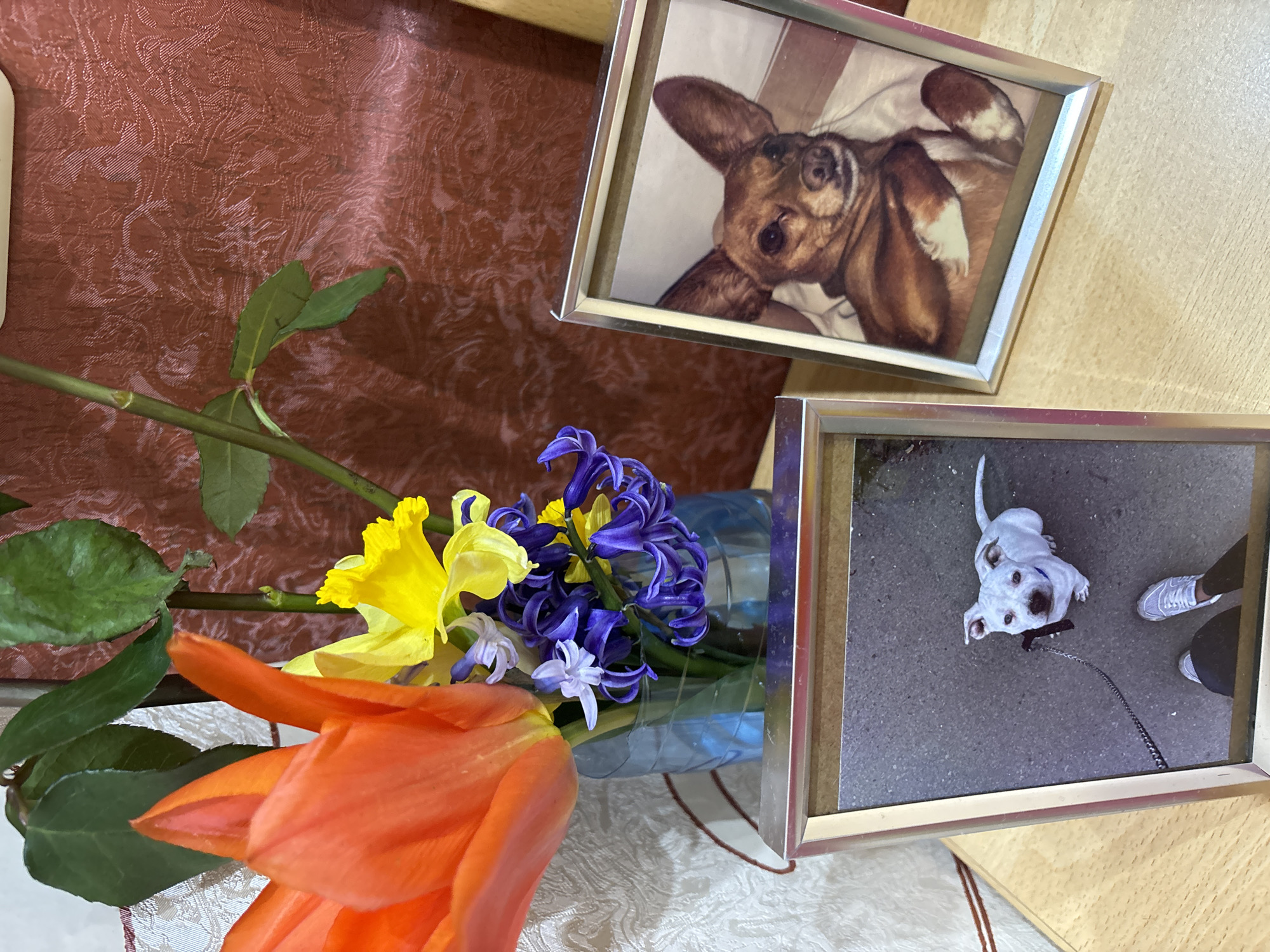 collection of objects on a table. There is a bouquet of flowers, including orange tulips, yellow daffodils, and purple hyacinths, arranged in a blue vase. Next to the flowers, two framed photos are resting on the table. One photo depicts a brown dog lying on its back. The other photo shows a white dog with a leash, looking up at the person holding the leash; a pair of sneakers is visible in the corner of the image. The background is a mix of patterns, including a red textured wall and a light-colored wooden surface. There is no explicit information to indicate that this picture was taken in Varna, Bulgaria.