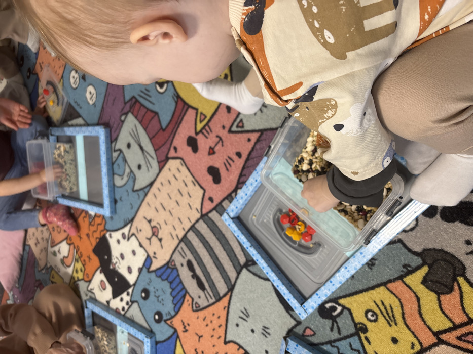 A child with a dog-patterned shirt and tan pants sits on a colorful cat-themed rug, playing with a clear container filled with beads and food. Other children sit nearby, each with a similar container placed on a square, framed base. The containers appear to be part of a sensory activity or sorting game, encouraging exploration and fine motor skills.