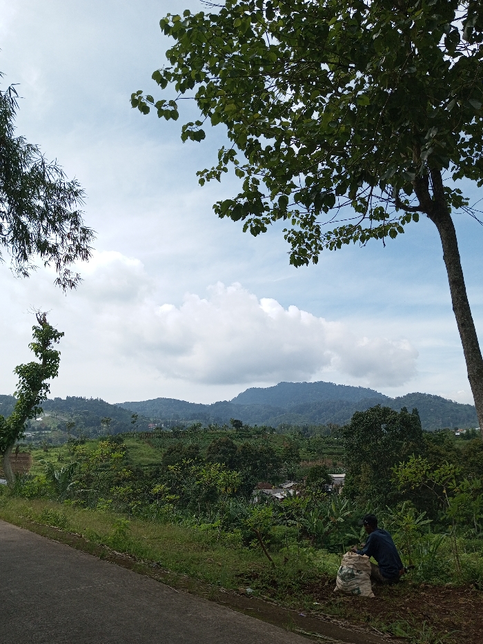 The image depicts a verdant, mountainous landscape in Kandenuwara, Sri Lanka, under a partly cloudy sky. A paved asphalt road occupies the lower-left foreground, bordered by green grass and exposed soil. A single individual, male, wearing a dark blue long-sleeved shirt, dark trousers, and a dark cap, is crouched on the exposed earth to the right of the road. This individual is positioned next to a large, light-colored sack, likely containing soil or agricultural amendments, and appears to be engaged in ground-level cultivation or planting. The immediate surroundings feature a variety of green foliage, including a large tree with dense leaves on the right side of the frame, partially obscuring the sky, and thinner, reedy vegetation on the left. The mid-ground extends into a valley and subsequent hills, characterized by extensive, lush green vegetation, including what appear to be terraced agricultural fields and numerous trees. Several small, light-colored structures are discernible amidst the greenery in the mid-distance. The far background is dominated by a range of dark green, forested mountains, rising beneath a light blue sky dotted with significant white cumulus clouds.