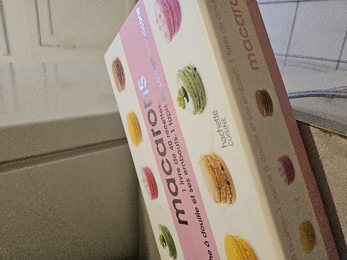 A rectangular white box, appearing slightly dusty, is displayed at an upward angle on a textured grey surface. The box features a prominent pink horizontal band across its upper face. Within this band, the word "macarons" is centrally printed in a reflective, possibly silver, typeface. Below the main title, smaller text in French reads "1 livre de 40 recettes" (1 book of 40 recipes) and "1 poche à douille et ses embouts, 1 tapis de cuisson en silicone" (1 piping bag and its tips, 1 silicone baking mat). Images of various colorful macarons are depicted on the box's surface, including pink, yellow, light brown, and green macarons, with the green one featuring a white decorative swirl. The "hachette CUISINE" logo is visible on the box. The background consists of a light grey, vertically textured surface, likely an appliance door or wall. No individuals are present, and no actions or interactions are occurring. The scene takes place indoors.