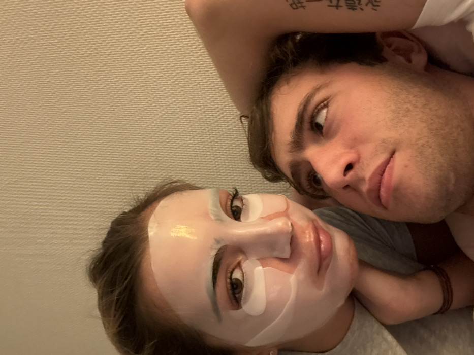 An indoor photograph captures two young adults in a close-up, casual setting in Eindhoven, Netherlands. In the foreground, on the left, a female subject with brown hair wears a white sheet facial mask, covering most of her face but exposing her eyes, nostrils, and mouth. She looks directly at the camera. Her left arm, adorned with a multi-strand bracelet, rests near the male subject's shoulder. The male subject, positioned on the right, has dark, curly hair and light facial stubble. He is looking upwards and to his right, away from the camera. A tattoo with vertical East Asian characters is visible on his inner right bicep/forearm. Both individuals appear to be wearing t-shirts; the female's is grey, and the male's is a lighter color. The background is a textured, light-colored wall, illuminated by warm artificial lighting.