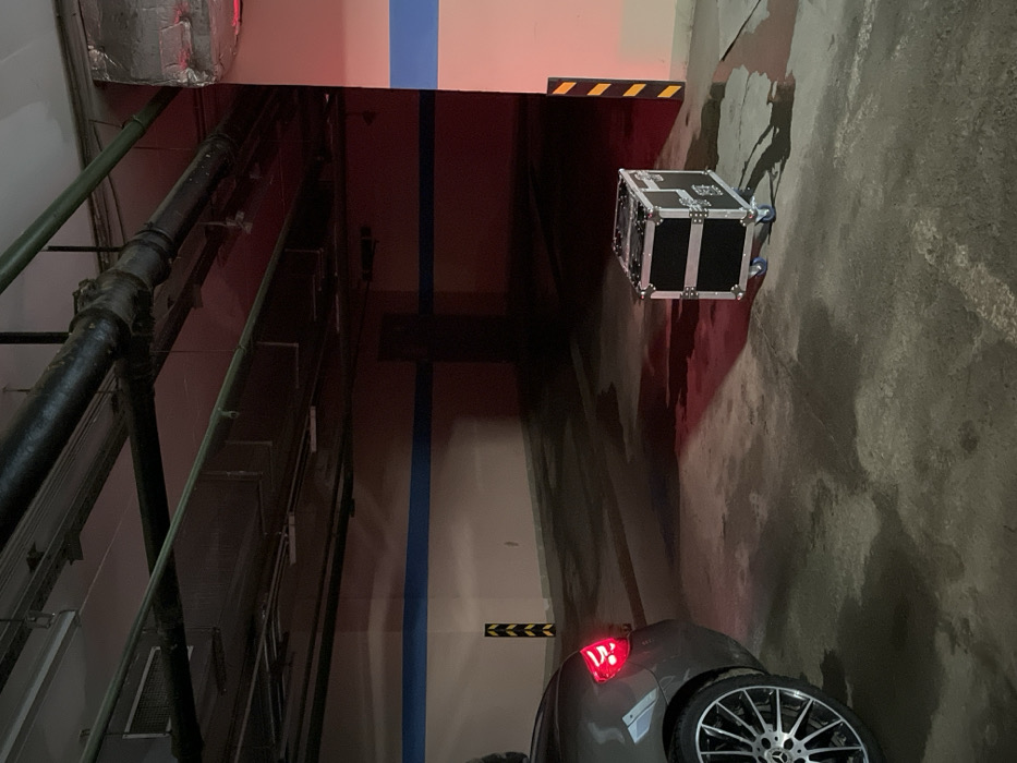 A distorted perspective of an indoor garage or storage area. A car with illuminated taillights occupies the lower portion, while a black metal case sits closer to the upper right. A wall with a blue stripe and directional hazard markings is visible. Industrial pipes and a metal structure run along a wall. The lighting is dim, with some areas appearing red. The overall impression is one of cramped space and utilitarian design.