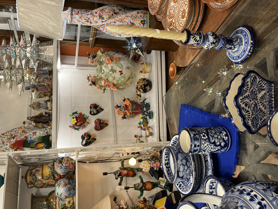 A vibrant display features shelves showcasing decorative pottery, statues, and star-shaped lights. A tabletop displays blue and white ceramic cups, plates, and a candle holder with a cream-colored candle. Vases with floral embellishments and heart-shaped wall hangings are visible. Below, whimsical alligator figurines add a touch of folk art to the collection. The diverse array of items reflects a rich artistic tradition.