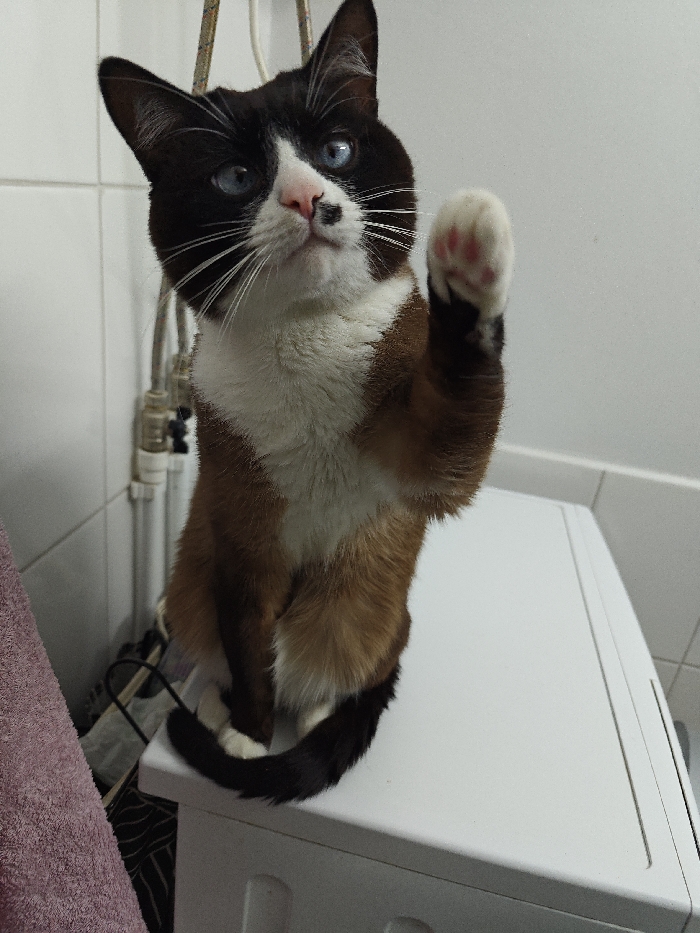 A captivating photo captures a domestic cat perched atop a white appliance, possibly a washing machine. The feline's coat is a striking mix of colors: black on the head and tail, white across the chest and paws, and brown on the body. It is sitting upright, one paw raised in a gesture that resembles a wave or a greeting. Its eyes are blue, and its expression appears alert and inquisitive. The background consists of a tiled wall and plumbing fixtures, which suggests that the appliance is situated in a bathroom or utility room.