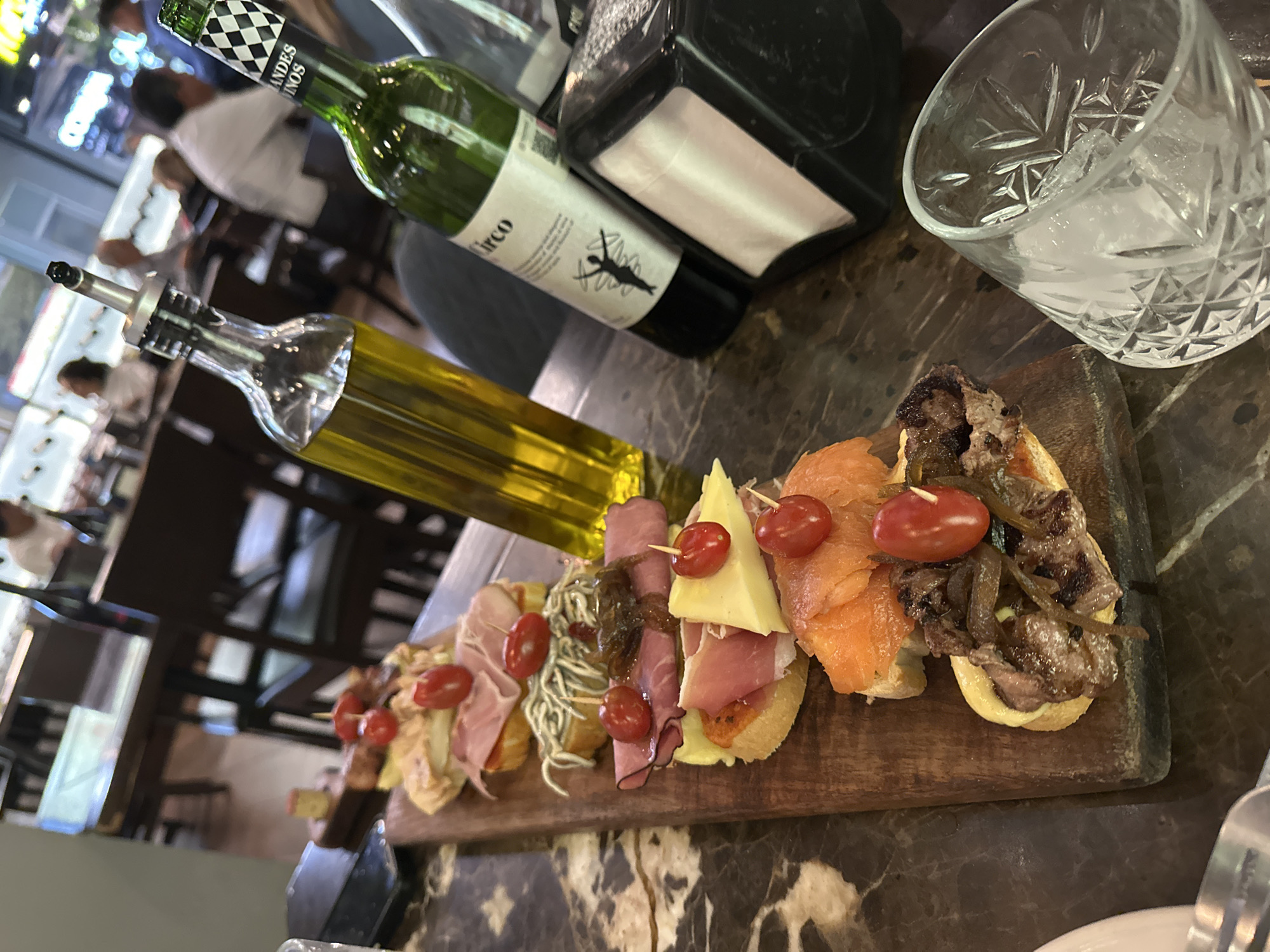 The image depicts an indoor dining scene at a restaurant in Puebla, Mexico. The specific address within Puebla is not discernible from the visual evidence. In the foreground, a dark brown, polished marble-patterned table features a wooden serving board laden with eight individual pintxos. From closest to furthest, the pintxos include: toasted bread topped with sliced grilled meat and caramelized onions, garnished with a cherry tomato; toasted bread with smoked salmon, garnished with a cherry tomato; toasted bread with a slice of yellow cheese and cured ham, garnished with a cherry tomato; toasted bread with sliced pastrami or cured beef and caramelized onions/relish, garnished with a cherry tomato; toasted bread with a white, eel-like surimi preparation (*gulas*), garnished with a cherry tomato; toasted bread with thinly sliced cured ham (prosciutto/jamón serrano style), garnished with a cherry tomato; toasted bread with a creamy spread and an unidentifiable topping, garnished with a cherry tomato; and a final, partially obscured pintxo with a light-colored topping. All visible cherry tomatoes are skewered with small toothpicks. To the right of the serving board, a clear glass bottle with a metal pour spout contains golden olive oil, approximately half full. Adjacent to it stands a dark green wine bottle with a white label featuring "Circo" and a stylized figure, and a checkered pattern on the neck labeled "GRANDES VINOS." This wine bottle is about two-thirds full. A black plastic napkin dispenser holding white paper napkins is positioned next to the wine bottle. In the bottom right corner, a clear, patterned glass tumbler containing ice cubes is partially visible. In the bottom left, the handle and tines of a silver fork are visible. A dark-cased smartphone is partially visible on the table behind the serving board. The background is softly blurred, revealing other patrons seated at dark-colored tables with matching chairs. Several individuals are present, some wearing light-colored shirts, engaged in dining or conversation. The environment suggests an active, modern restaurant or bar setting with ambient lighting.