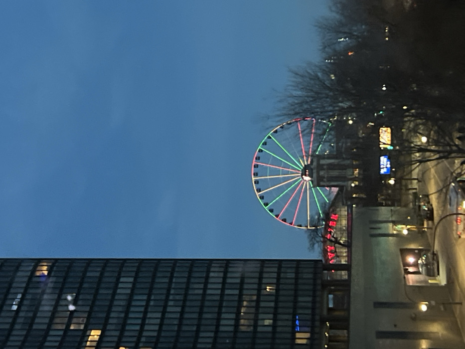 A nighttime view reveals a large Ferris wheel lit with green, pink, and white lights dominating the scene. In the foreground, the dark, windowed façade of a building stands prominently. The background features streetlights, bare trees, and blurred buildings. The sky is a gradient of dark blue, adding to the urban evening ambiance. A building with bright red lettering is also visible near the base of the Ferris wheel.