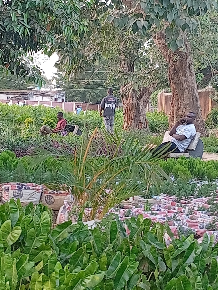 A green, lush park landscape holds several people. One person sits on a bench, using a cell phone. A man wearing a black t-shirt walks through the park, while another person sits among the vegetation in the background. Cement bags lie in the foreground, partially hidden by large leafy plants. Dense trees provide shade overhead, and a building structure is visible in the far background.