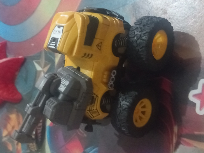 A toy truck is yellow with gray accents. It has chunky wheels with yellow hubs and springs. A gray mechanical arm extends from the side. The truck sits on a surface with a cartoon-like design, featuring red, white, blue, and other colors. A red object and a white star sticker are also on the surface.