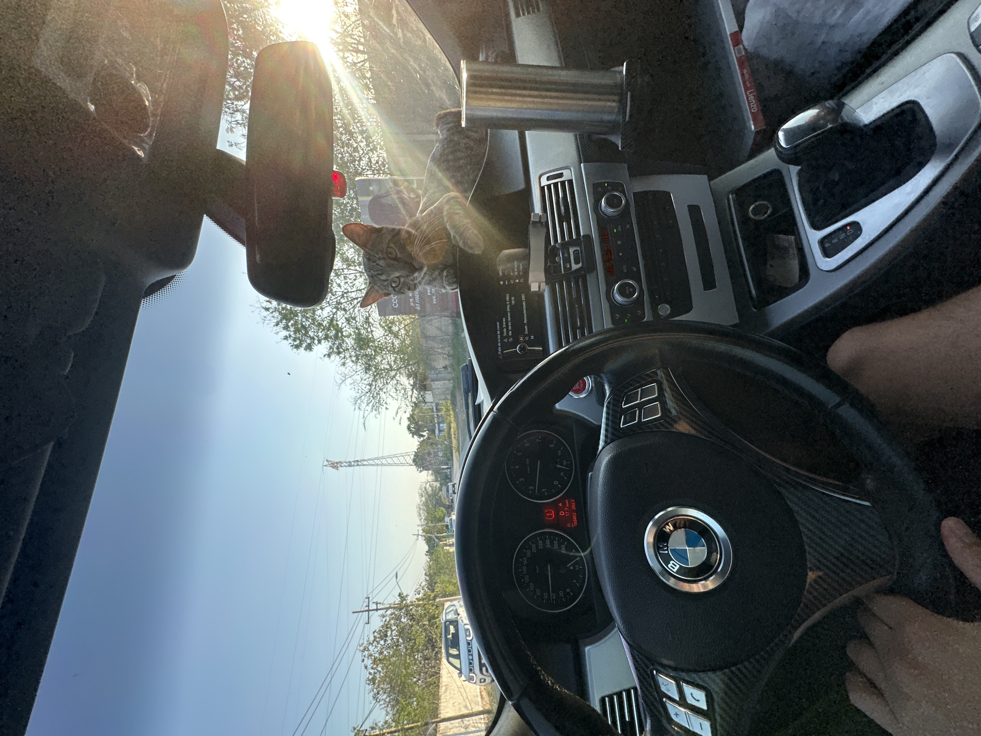 The scene is taken from inside a BMW car, likely in Mérida, Mexico, as suggested by the language on the car's audio display ("Me Veras Volver"). The camera's perspective is from the driver's seat, looking out at the road. A cat is perched on the dashboard, between the center console and the windshield. The car is stationary, as indicated by the speedometer reading. The sky is bright and sunny. Power lines are visible outside the car's windshield. The driver's hands are visible on the steering wheel.
