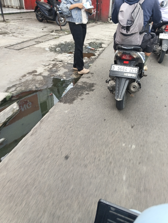 The image depicts a street scene in Margahayu, Indonesia. The foreground features an asphalt road, extending into the mid-ground. To the left, a concrete sidewalk runs parallel to the road, bordered by a narrow, water-filled gutter reflecting red and white architectural elements. Debris is present on the sidewalk and within the gutter. On the sidewalk, a person is standing, visible from the mid-torso downwards, dressed in a light-colored denim jacket, dark trousers, and light brown clogs. This individual holds several white rectangular items in their hands. Behind them, a black scooter is parked next to a red-walled building with a closed metal storefront. On the asphalt road, a black scooter, license plate D 5664 ZCS with a '09-27' validation date, is viewed from the rear. The scooter operator, wearing a dark hooded garment and dark shorts, carries a gray backpack. A second scooter, partially visible behind the first on the road, displays a partial license plate of D 432.... The environment represents an active urban thoroughfare.