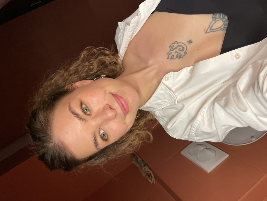 A woman with curly hair, wearing a white shirt over a black top, poses for a selfie in a bathroom. Visible tattoos are on her chest and shoulder. The background features a terracotta-colored wall, a toilet flush plate, and a hint of a patterned scarf or fabric. The image is rotated slightly, and the camera angle is from above.