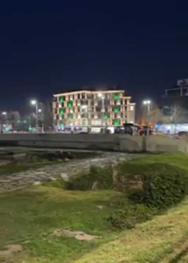 The video captures a night scene in an urban area. In the foreground, there's a grassy area with stone structures that look like ancient ruins. Across from this, a modern building with a grid-like facade is illuminated with white and green lights. Further down the street, there's traffic including cars and a bus. In the background, there's another building, and a structure situated on a hill is lit up. The sky is dark. The camera pans slightly to the left during the video.