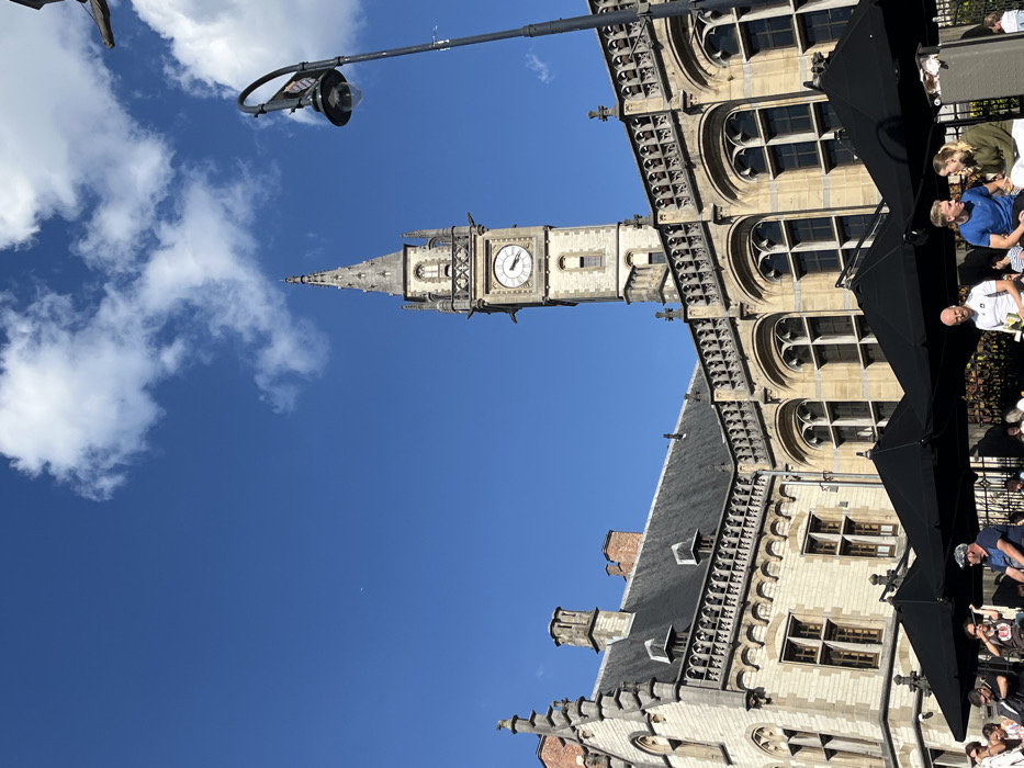 - "The image displays an outdoor scene in Ghent, Belgium, featuring the Ghent City Hall complex, specifically the Cloth Hall (Lakenhalle) and its clock tower" by FM-NQrs03, licensed under CC BY 4.0