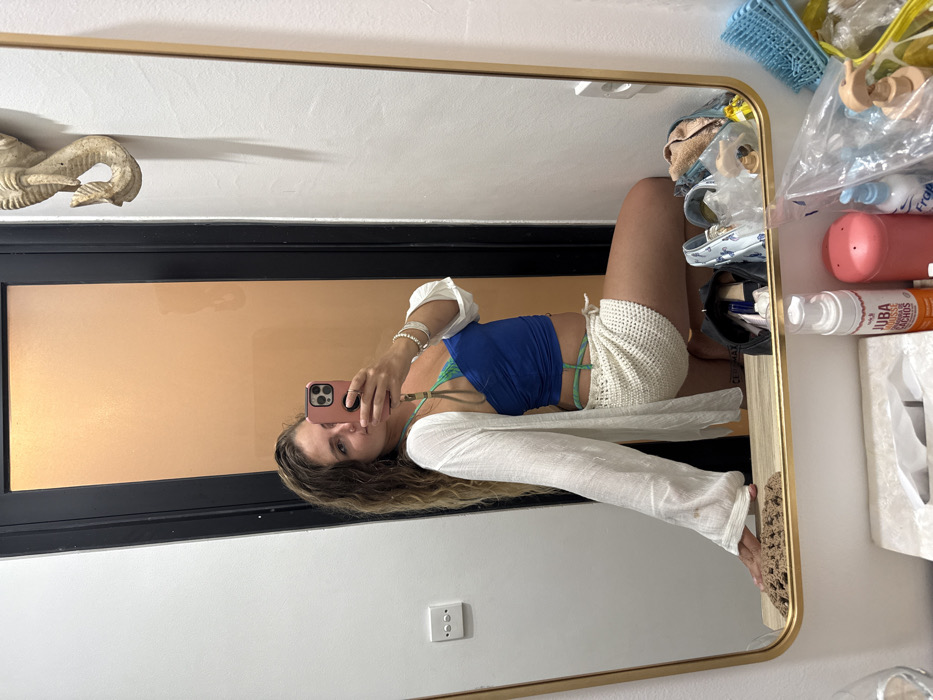 This image depicts a young adult female taking a mirror selfie in what appears to be a private room, potentially a bathroom or dressing area, in Kutuh, Indonesia. The female, with long, wavy, light brown hair, is captured from the mid-thigh up in a crouching or kneeling pose, angled slightly towards her left. She holds a pink smartphone in her right hand, which is raised to capture her reflection. Her left hand rests on a wooden ledge beneath the mirror. She is wearing a blue halter-style crop top with visible green straps beneath and around her waist, paired with cream-colored, crocheted shorts. A sheer, white, long-sleeved cover-up or cardigan is worn over her top. Accessory details include multiple silver-colored bracelets and a ring on her right hand, and a small stud nose piercing. The mirror has a gold-colored frame. Reflected in the background behind the female are a dark door frame with a light brown-orange panel, and a white wall with a visible electrical outlet. To her right, a light-colored, carved wooden object, resembling a mythical aquatic creature or seahorse, is mounted on a white wall. The wooden ledge below the mirror holds various items, including a brown crocheted item, a black open pouch containing cosmetics, light blue patterned slip-on shoes, clear plastic bags containing miscellaneous objects, and a blue scrub brush. On the white vanity surface beneath the ledge, a white tissue box, a white pump bottle (partially labeled "JUBA"), a pink cylindrical container, a blue pump bottle, and additional plastic bags are visible.