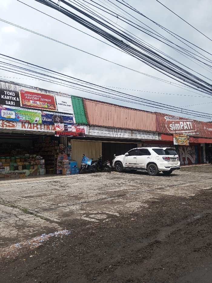 The image depicts a commercial street frontage in Sandamal Eliya, Sri Lanka, under an overcast sky. The foreground features a worn, cracked concrete or asphalt surface with scattered light-colored debris on the left, transitioning to a rough, muddy dirt path with visible tire tracks on the right. Along the background, a row of single-story commercial buildings is visible. The leftmost building section is an open retail store, identified by multiple Indonesian-language signs including "TOKO KARTIKA SARI", "Sedaapnya FAVORIT SEMUA", and advertisements for "KS KARTIKA", "JUARA", "Kie-Tech Perancis", "LEZAT", "COKLAT", and "DUNHILL". The interior displays shelves stocked with various packaged goods, and cases of bottled water are stacked outside. The roof section directly above this store is green corrugated metal. To the right of the open store, a segment of the building features a closed, corrugated metal roll-down door, possibly for a garage or storage unit. Two motorcycles are parked in front of this door; one is blue and white, and the other is dark-colored. The roof section above this segment is reddish-brown corrugated metal. Further to the right, another building segment displays a prominent red sign with "simPATI" (an Indonesian mobile network operator). Below this, the lower wall features colorful graffiti or murals. This section also has a reddish-brown corrugated metal roof. No people are visible in the scene. A white Toyota Fortuner SUV is parked diagonally in front of the middle and right building sections, facing slightly left. Numerous black electrical or communication cables crisscross the upper portion of the frame against the grey sky.