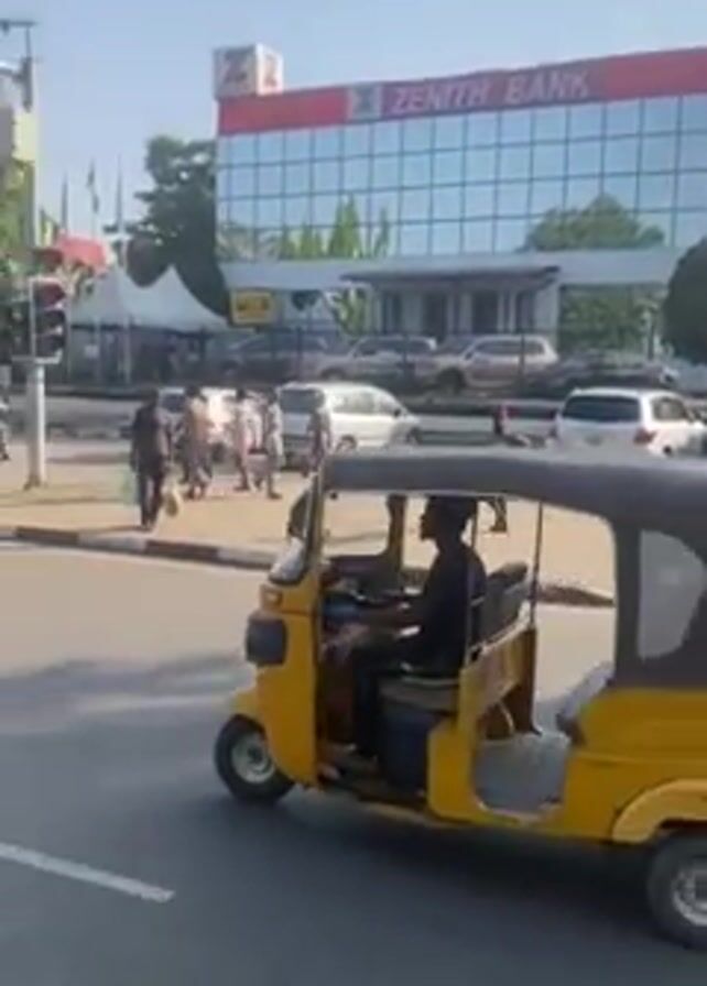 street scene in front of a Zenith Bank branch. Several yellow auto rickshaws, also known as kekes, are visible on the road. People are walking along the sidewalk and crossing the street. The traffic light is red. There are parked cars near the bank. A signpost is close to the camera. The weather appears to be sunny.