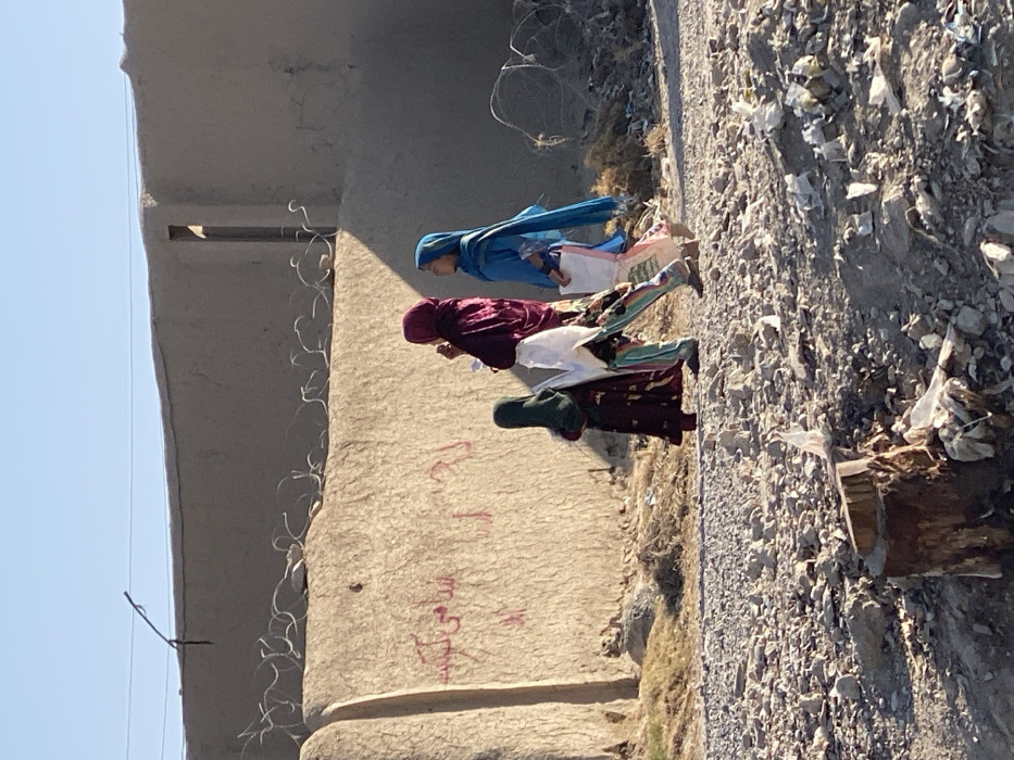 The image captures a ground-level view of a dusty, semi-urban environment in کوکران, Afghanistan. Three females are depicted walking from left to right on a rough, unpaved path composed of dirt, gravel, and scattered debris including plastic bags and other refuse. In the immediate foreground to the lower left, a dark brown tree stump is visible, surrounded by additional litter. In the midground, the three females walk in single file. The leftmost figure, a younger female, wears a dark green head covering and a long, dark patterned dress. The middle figure, an adult female, wears a dark maroon head covering and a colorful, patterned long dress; she holds a folded white cloth or thin bag in her left hand and appears to be touching her face with her right hand. The rightmost figure, also an adult female, wears a vibrant blue head covering that drapes over her shoulders and a light-colored, patterned dress; she carries a white plastic bag with visible contents in her left hand. All three appear to be wearing open-toed footwear. The background is dominated by a light-brown, textured mud or adobe wall, roughly constructed, stretching horizontally across the frame. Red Farsi script graffiti is visible on the lower-left section of this wall. Along the top edge of this wall, concertina barbed wire is installed. Further back, a darker, higher wall section or structure is visible, partially obscured by shadow. The sky above is clear and light blue, indicating daylight. Sunlight illuminates the scene from the right, casting shadows from the figures and structures onto the ground and the wall.