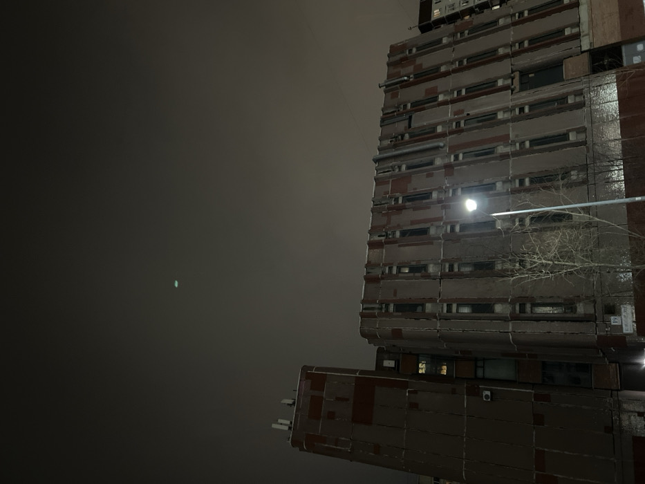 A tall, imposing brutalist building dominates the right side of the frame. The structure features a repeating pattern of rectangular modules with small windows. A bright street lamp illuminates the building's facade. Bare tree branches add a stark detail to the scene. The left side of the image is filled with a uniformly dark and clouded night sky. A faint green glimmer is visible in the distance. The perspective is from below, looking up at the towering building.