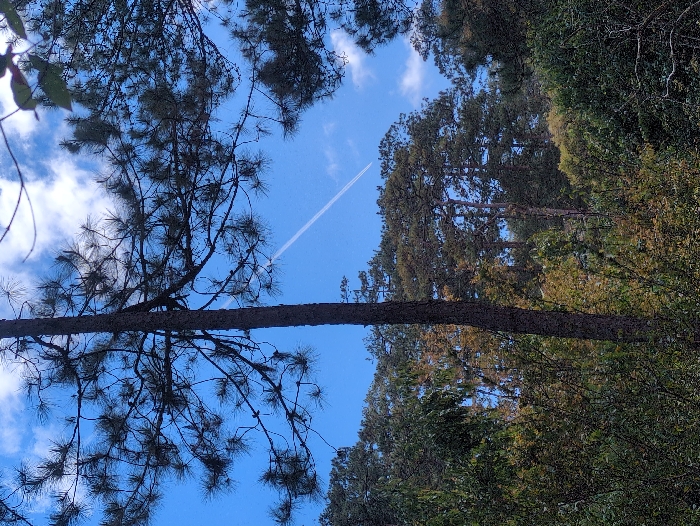 The image depicts a wooded area, likely a forest or parkland, within or near the city of Phát Chi, Vietnam. The scene is dominated by dense tree cover under a partially cloudy blue sky. A tall, slender pine tree with dark bark and sparsely needled branches is centrally positioned, extending from the bottom to the upper portion of the frame. Numerous other trees and varying foliage, presenting shades of dark green, lighter green, and some yellowish-brown, occupy the midground and background, suggesting a mixed forest composition. In the upper sky, a single, thin white contrail from an unseen aircraft diagonally crosses from the middle-left towards the upper-right. White, cumulus-like clouds are scattered across the blue sky. No human subjects, animals, or artificial structures are visible.