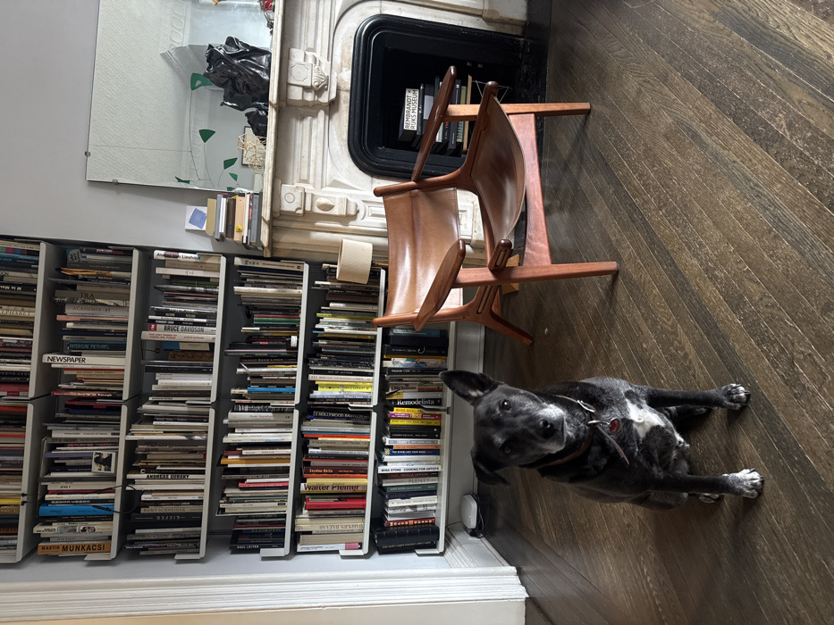 This image displays the interior of a residential room, consistent with a pre-war apartment found in the city of New York, United States of America. The room features dark hardwood flooring laid in a diagonal pattern. In the foreground, a medium-sized, short-haired dog, primarily dark gray or black with white markings on its chest and paws, sits facing the camera. The dog exhibits some graying on its muzzle, wears a dark collar with a red tag, and has one ear upright with the other slightly lowered. To the right and slightly behind the dog stands a mid-century modern lounge chair with a dark wooden frame and light brown leather sling seat and back. The left wall is dominated by a white, floor-to-ceiling modular bookshelf system, densely filled with numerous books, many appearing to be art or photography volumes. A small white electronic device rests on the floor beneath the lowest shelf. The right side of the room features an ornate, white marble fireplace mantel. Inside the firebox opening, a stack of books is visible, including one titled "REMBRANDT RIJKSMUSEUM." A large, unframed rectangular mirror is mounted horizontally above the mantel, reflecting parts of the room. The mantelpiece holds a small table lamp with a beige cylindrical shade, a stack of books, a small blue square card, and two dark, abstract decorative objects. The walls are painted a light gray. The room is illuminated by natural light from an unseen source. No human subjects are present.