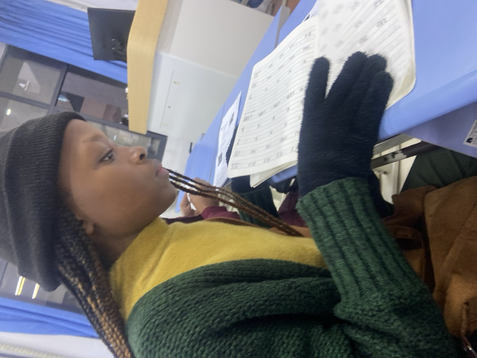 A young woman in a black beanie, yellow sweater, and dark green cardigan studies papers. She has long brown braids. The hand closest to the camera is wearing a black glove with a ribbed green cuff. The papers have handwritten numbers and symbols on them. A blue surface and some brown bags are also visible. The image is rotated counter-clockwise.