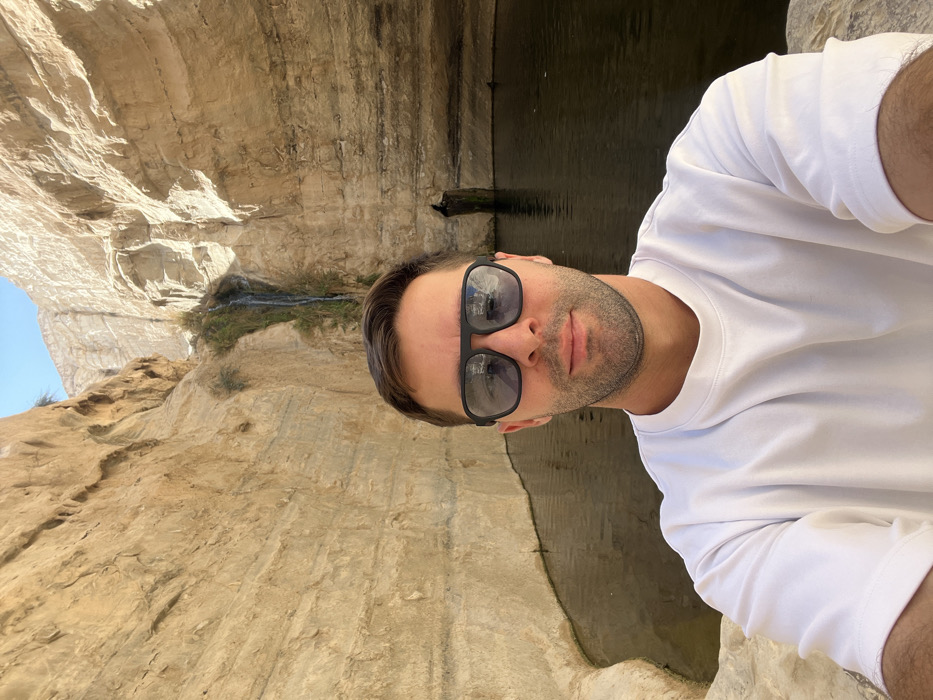 The image depicts a male individual in the foreground, positioned in front of a natural desert oasis, identified as Ein Avdat National Park within the Ramat Negev Regional Council, Israel. The male has short dark hair and light facial stubble, wearing black-framed sunglasses with dark lenses and a plain white t-shirt. He is looking directly at the camera, indicative of a selfie. Behind him, a dark-colored natural pool of water extends across the middle ground. A slender waterfall descends a dark, moss-covered rock face into this pool, centrally located in the background. Steep, light tan-colored limestone canyon walls rise dramatically on either side and behind the pool and waterfall, showcasing visible sedimentary layers. A small, dark alcove or cave opening is visible in the rock face to the right of the waterfall. The upper canyon walls are brightly lit by sunlight, while the area around the pool and waterfall appears partially shaded.
